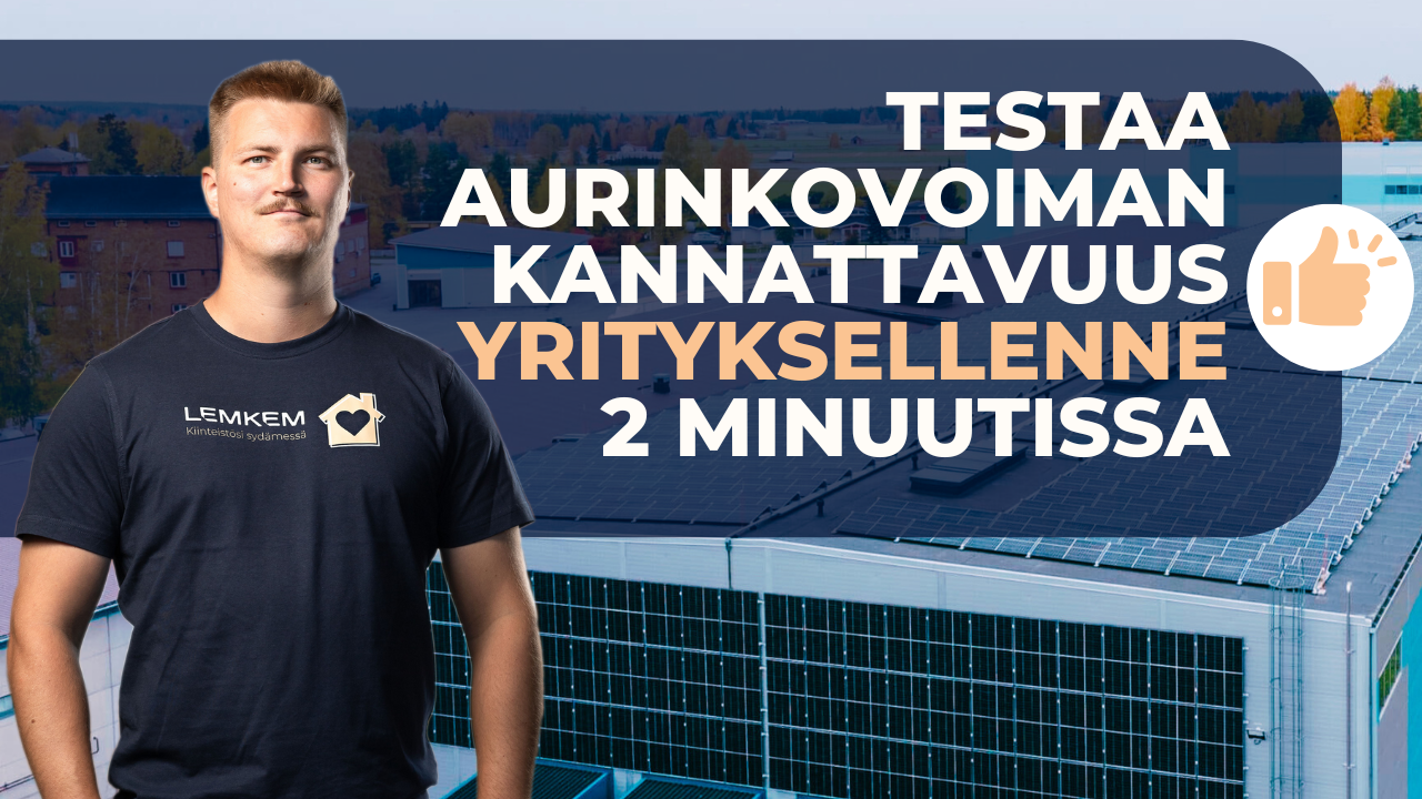 Tervetuloa Lemkemin aurinkovoimalaskuriin. Laskurin avulla saat parissa minuutissa selvitettyä aurinkovoiman kannattavuuden yrityksellenne. Aloita kirjoittamalla yrityksenne osoite. Osoitteen avulla voimme simuloida voimalan tuottoa satelliittikuvien ja tietokonemallinnuksen avulla.